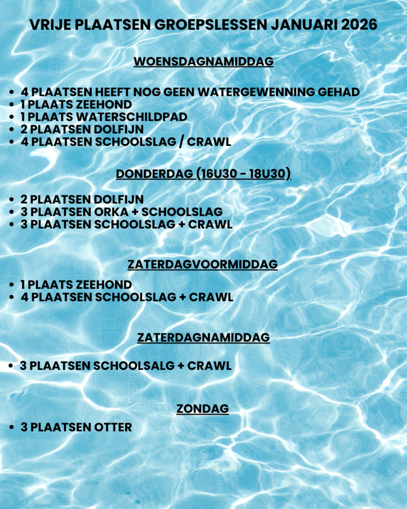 In onze jongste groepjes (nog geen watergewenning gehad) vragen wij 1 begeleider mee in het water, dit ter ondersteuning van de lesgever én voor de veiligheid van de kinderen.